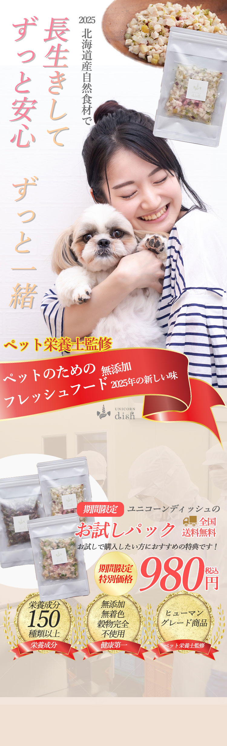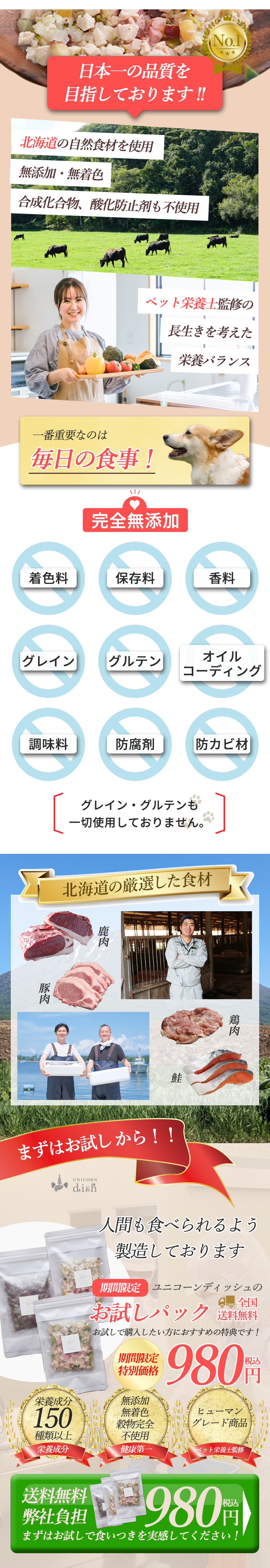 開発者自身が愛犬家で、健康で長生きできる本当のフレッシュフードを一から開発したいという思いから、北海道ユニコーンディッシュを開発。